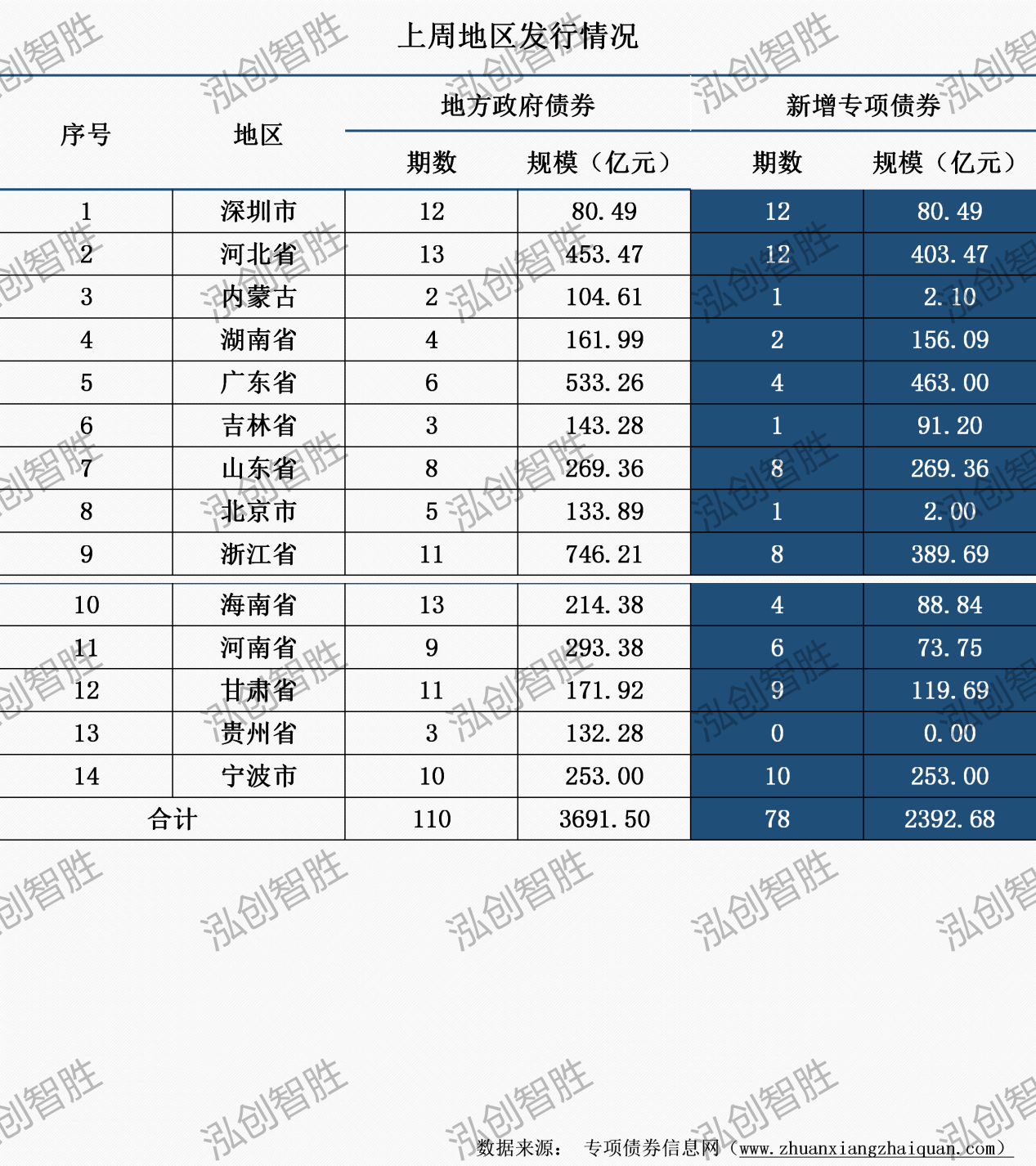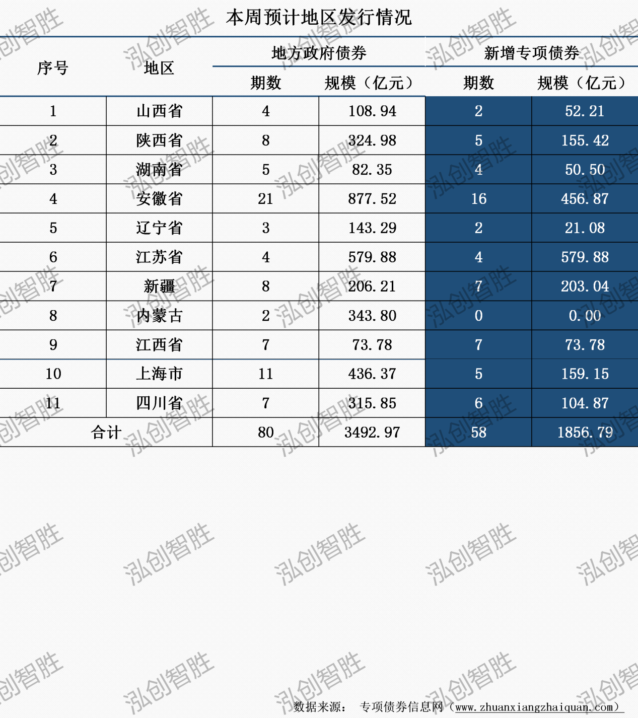 本周共有四川、江西等11個(gè)地區(qū)發(fā)行80期地方政府債券,發(fā)行規(guī)模3493億元;其中,涉及58期新增專項(xiàng)債券,發(fā)行規(guī)模1857億元。