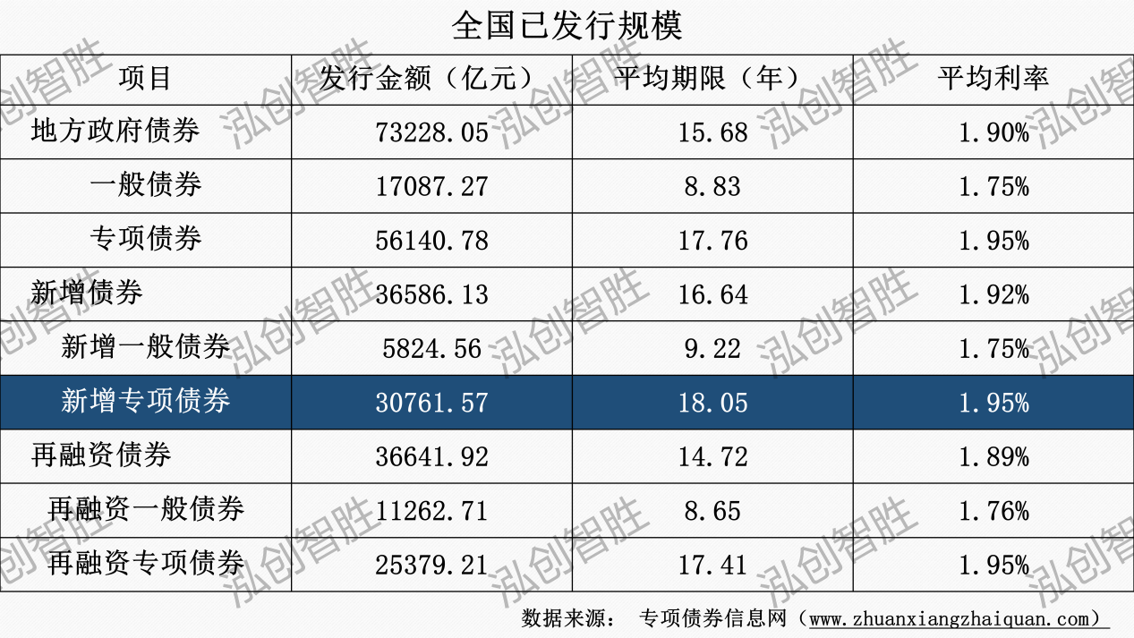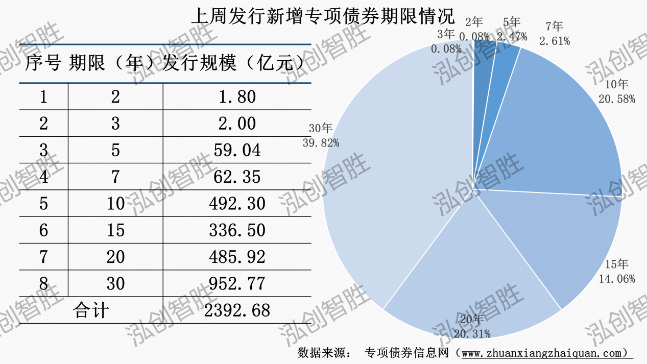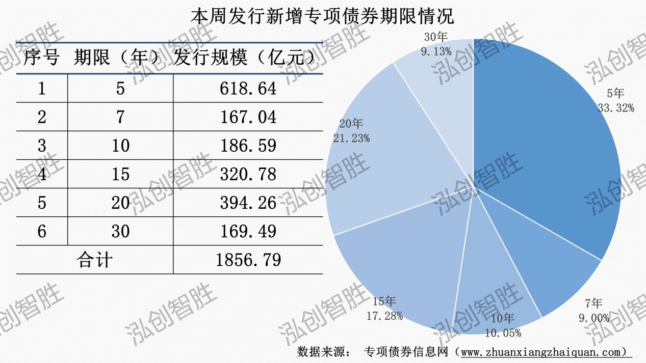 本周發(fā)行新增專項(xiàng)債券涉及6種期限類型,5年期、7年期、10年期、15年期、20年期、30年期。