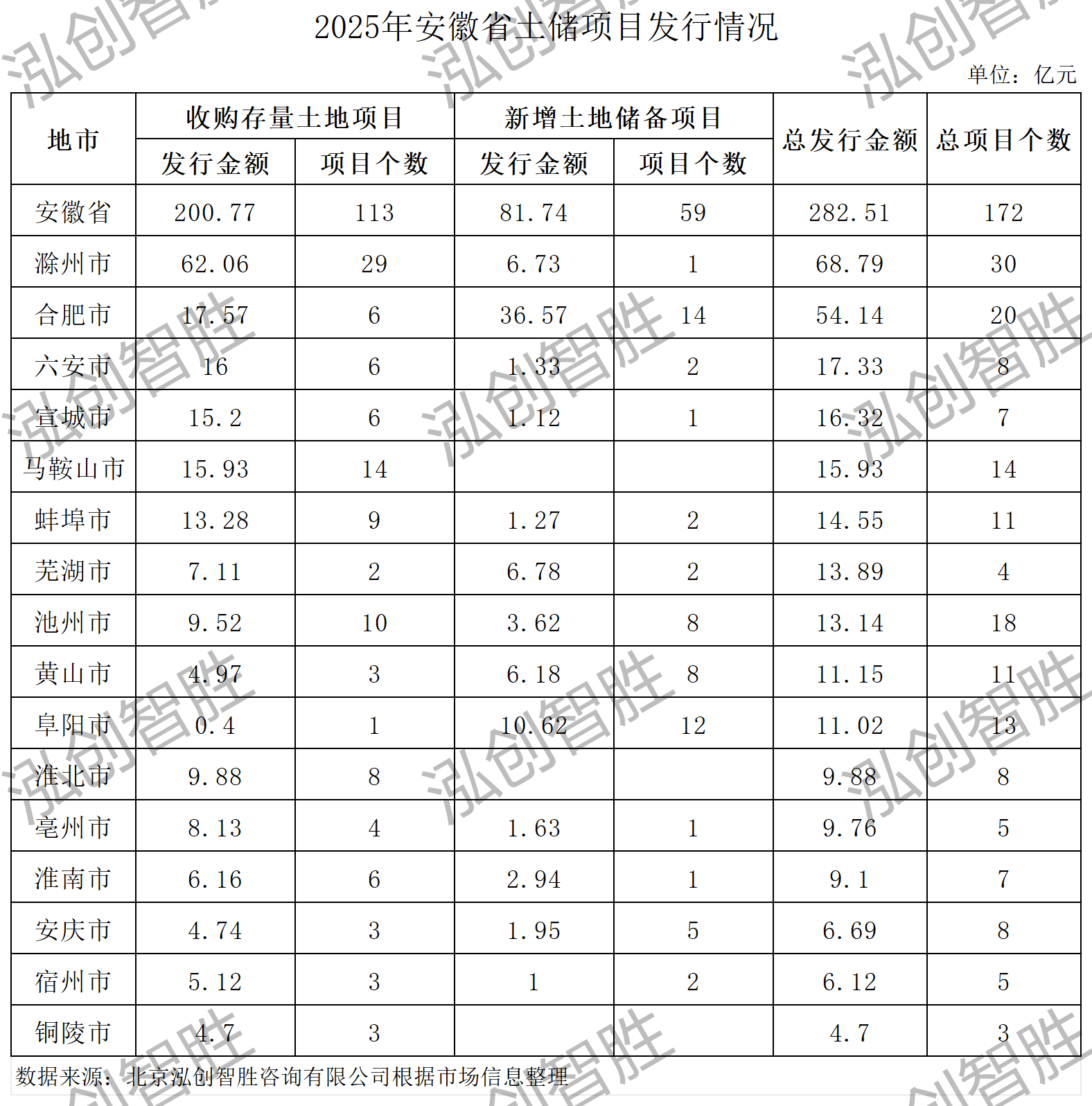 安徽省2025年共發(fā)行土地儲(chǔ)備項(xiàng)目172個(gè),發(fā)行總金額282.51億元,其中收購存量土地項(xiàng)目113個(gè),發(fā)行金額200.77億元;新增土地儲(chǔ)備項(xiàng)目59個(gè),發(fā)行金額81.74億元。