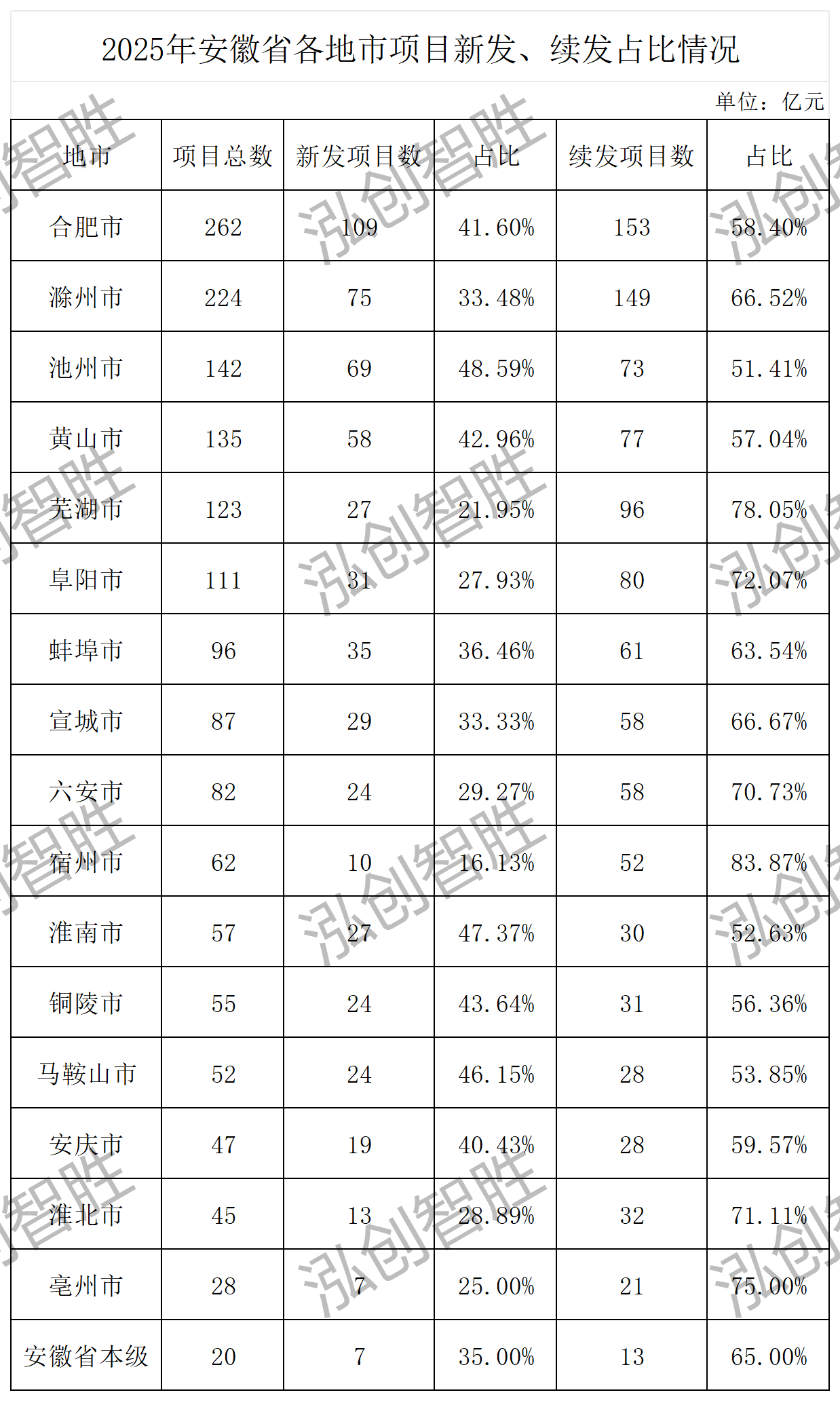 新發(fā)項(xiàng)目數(shù)量最多:合肥市新發(fā)項(xiàng)目109個(gè),占該市建設(shè)類項(xiàng)目總數(shù)的41.60%,作為省會(huì)城市,新項(xiàng)目儲(chǔ)備充足,發(fā)展動(dòng)能強(qiáng)勁;