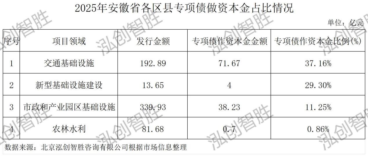 2025年安徽省1345.59億元新增專項(xiàng)債券(建設(shè)類項(xiàng)目)中,114.6億元用于充當(dāng)項(xiàng)目資本金,占比8.52%。