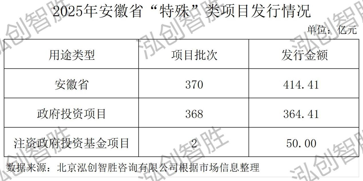 安徽省2025年共發(fā)行8期414.41億元“特殊”類項(xiàng)目,涉及370個(gè)項(xiàng)目批次,其中: