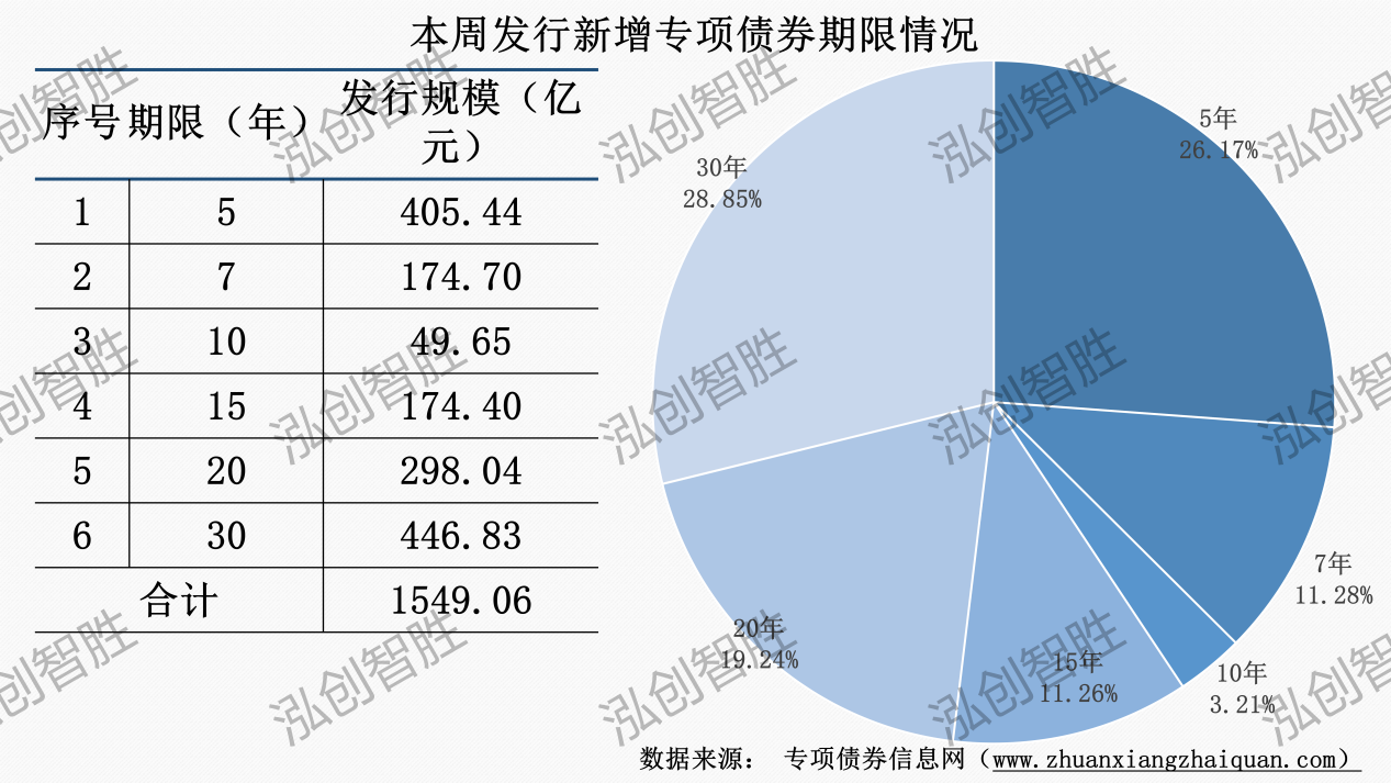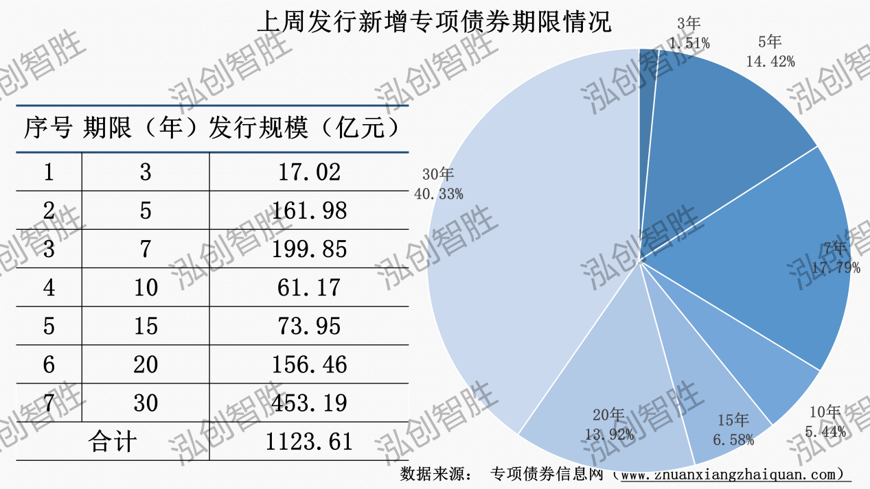 上周發(fā)行新增專項(xiàng)債券涉及7種期限類型,3年期、5年期、7年期、10年期、15年期、20年期、30年期。