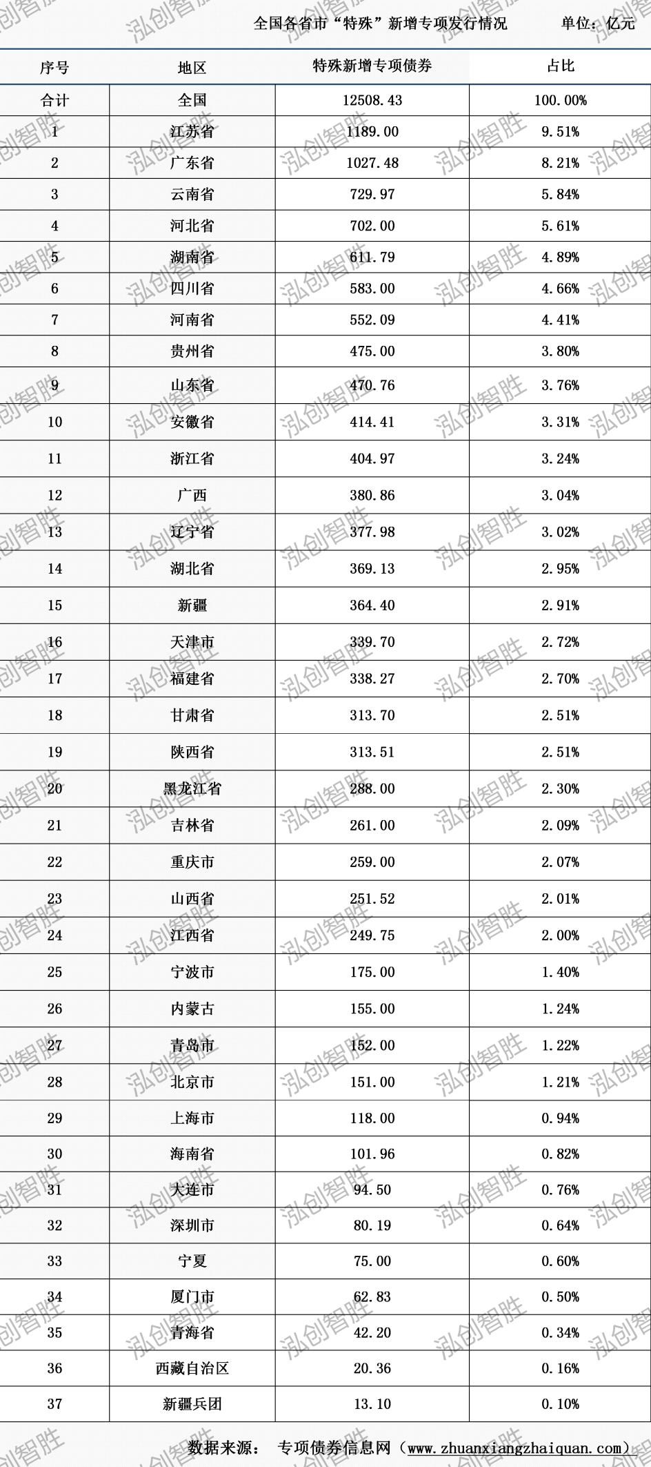 截至10月26日,已有江蘇省、廣東省等37個(gè)地區(qū)發(fā)行“特殊”新增專項(xiàng)債券,發(fā)行規(guī)模12508.4294億元;