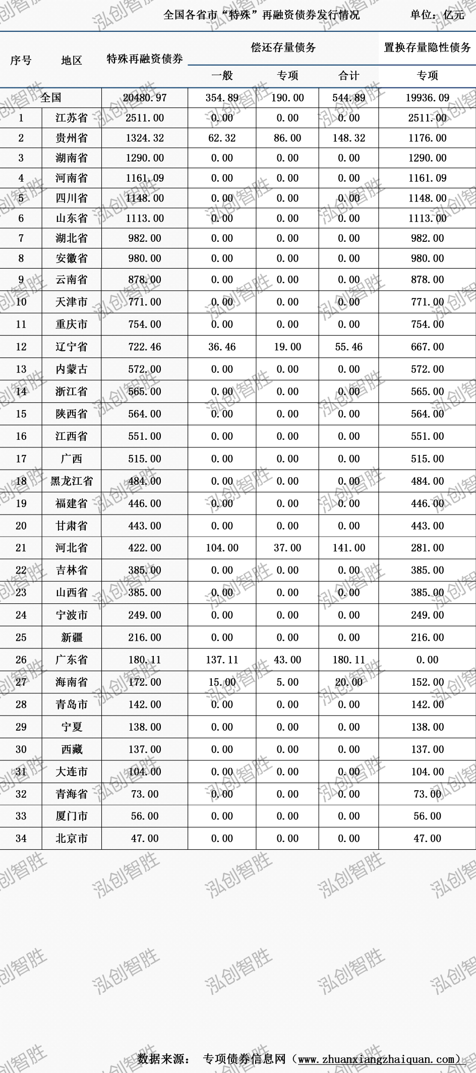 已有34個(gè)地區(qū)發(fā)行“特殊”再融資債券,發(fā)行規(guī)模20480.9717億元;用于“置換存量隱性債務(wù)”和“償還存量債務(wù)”。